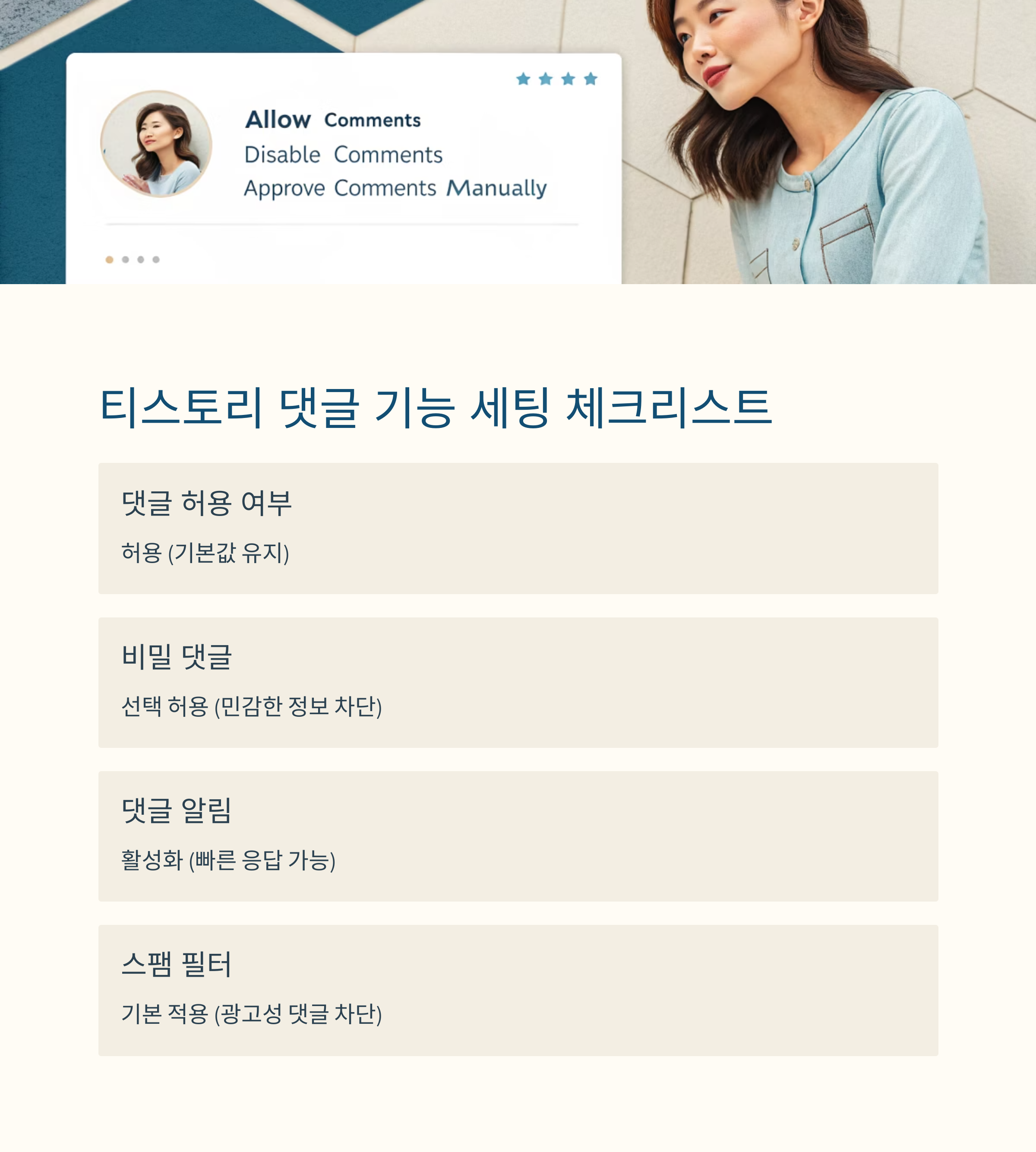 | 스팸 필터 | 기본 적용 | 불필요한 광고성 댓글 차단 |