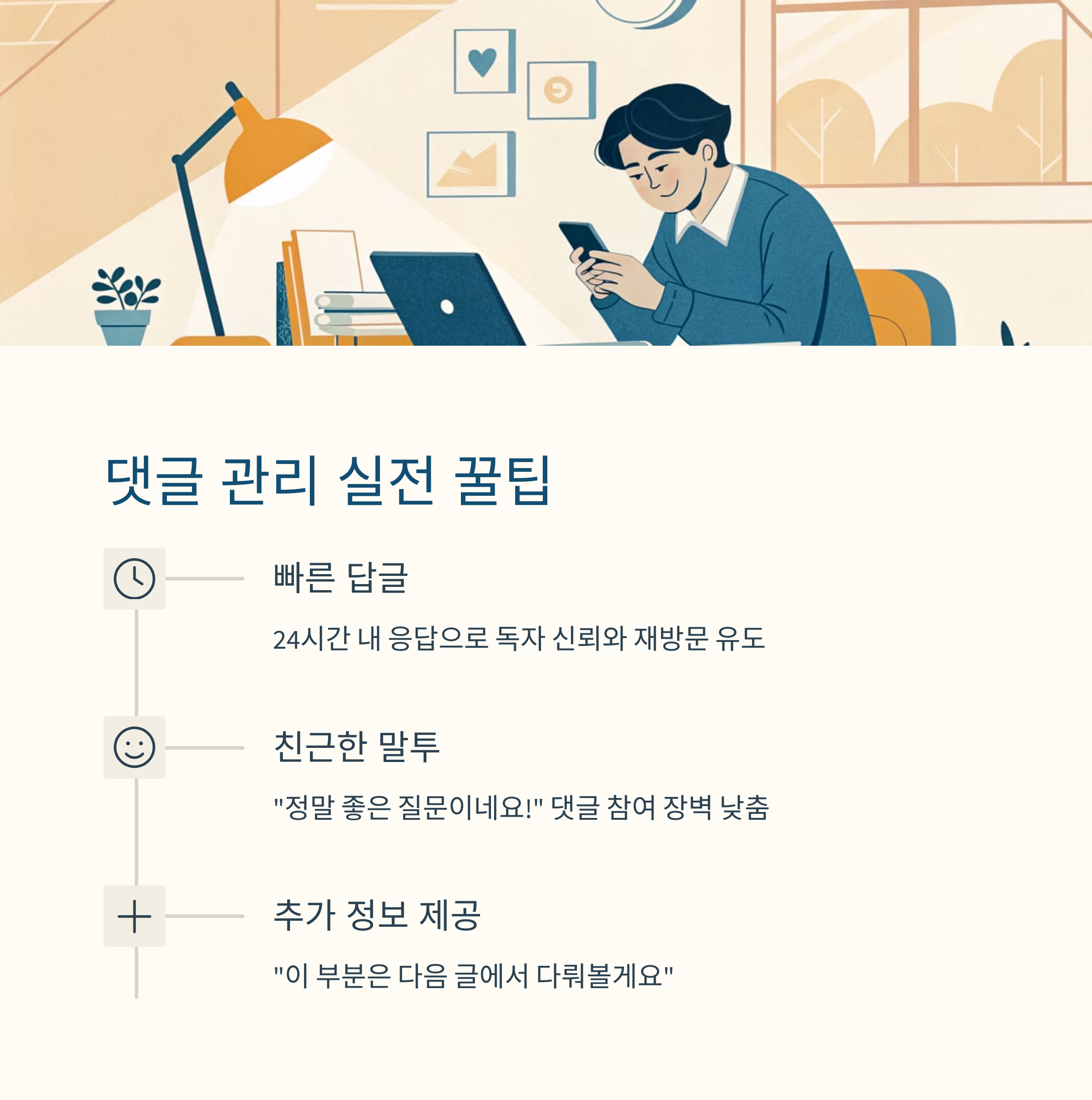 | 추가 정보 제공 | 댓글로 콘텐츠 확장 | "이 부분은 다음 글에서 다뤄볼게요" |