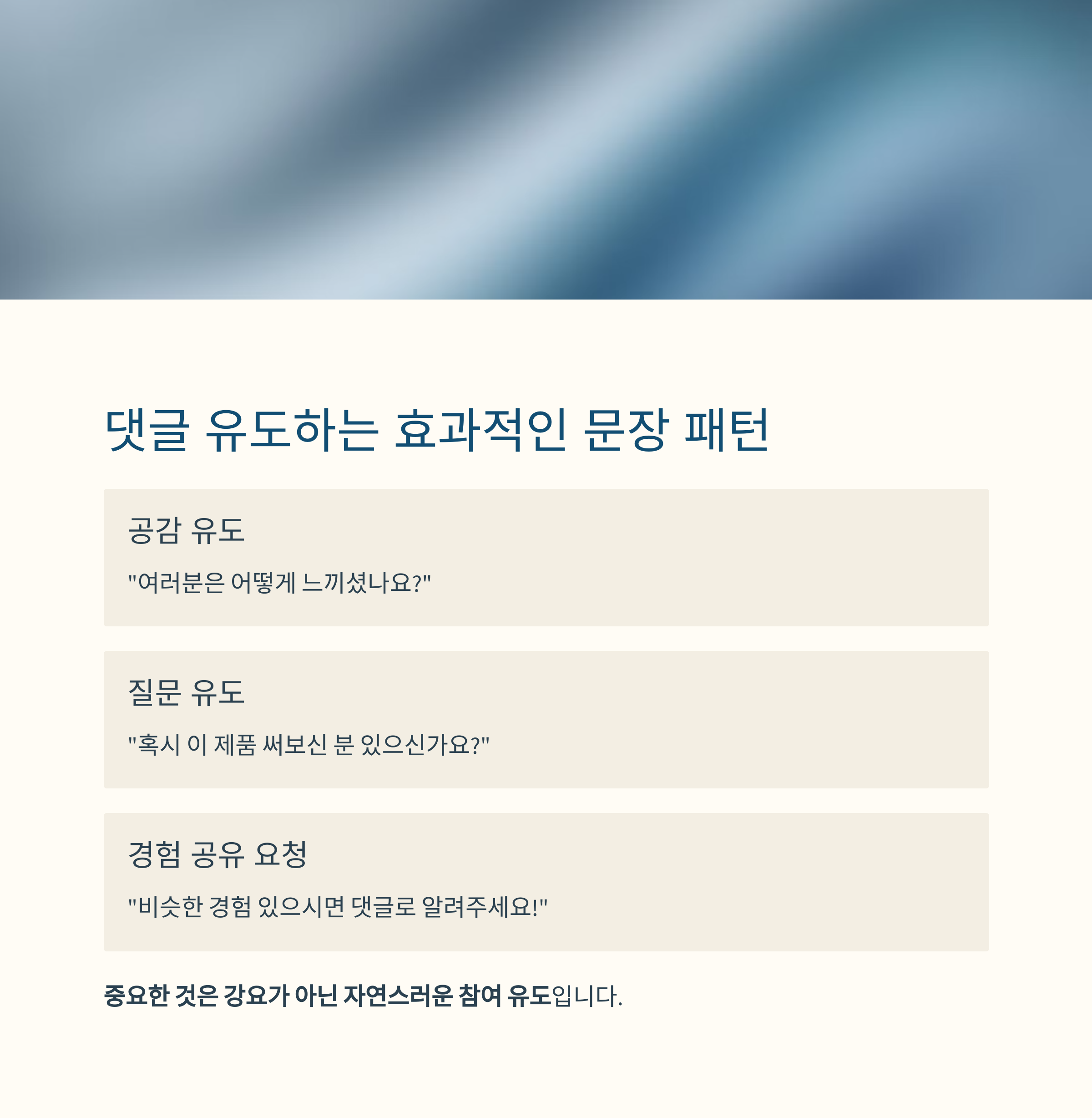 | 경험 공유 요청 | "비슷한 경험 있으시면 댓글로 알려주세요!" |