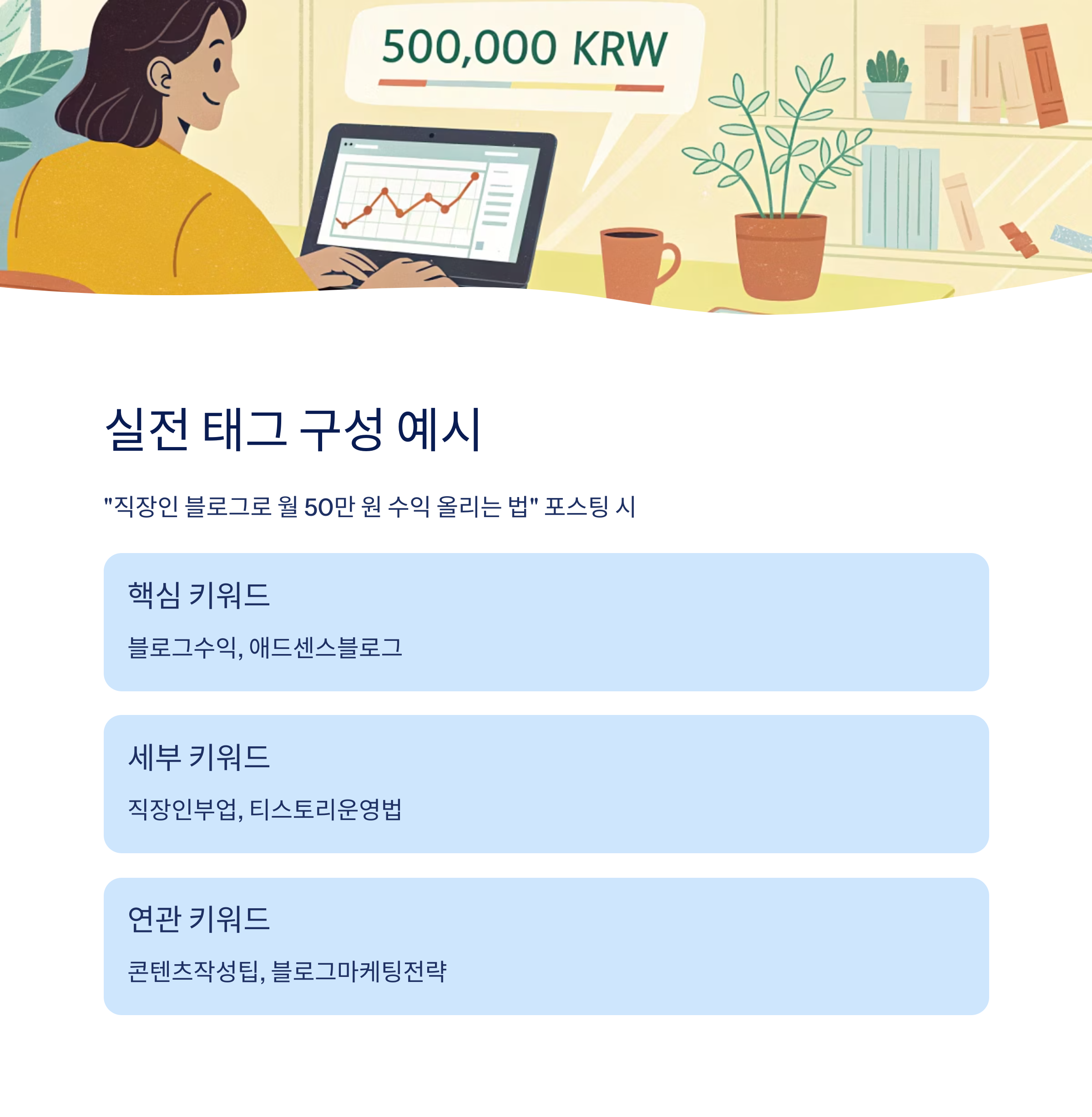 예: "직장인 블로그로 월 50만 원 수익 올리는 법" 포스팅 시