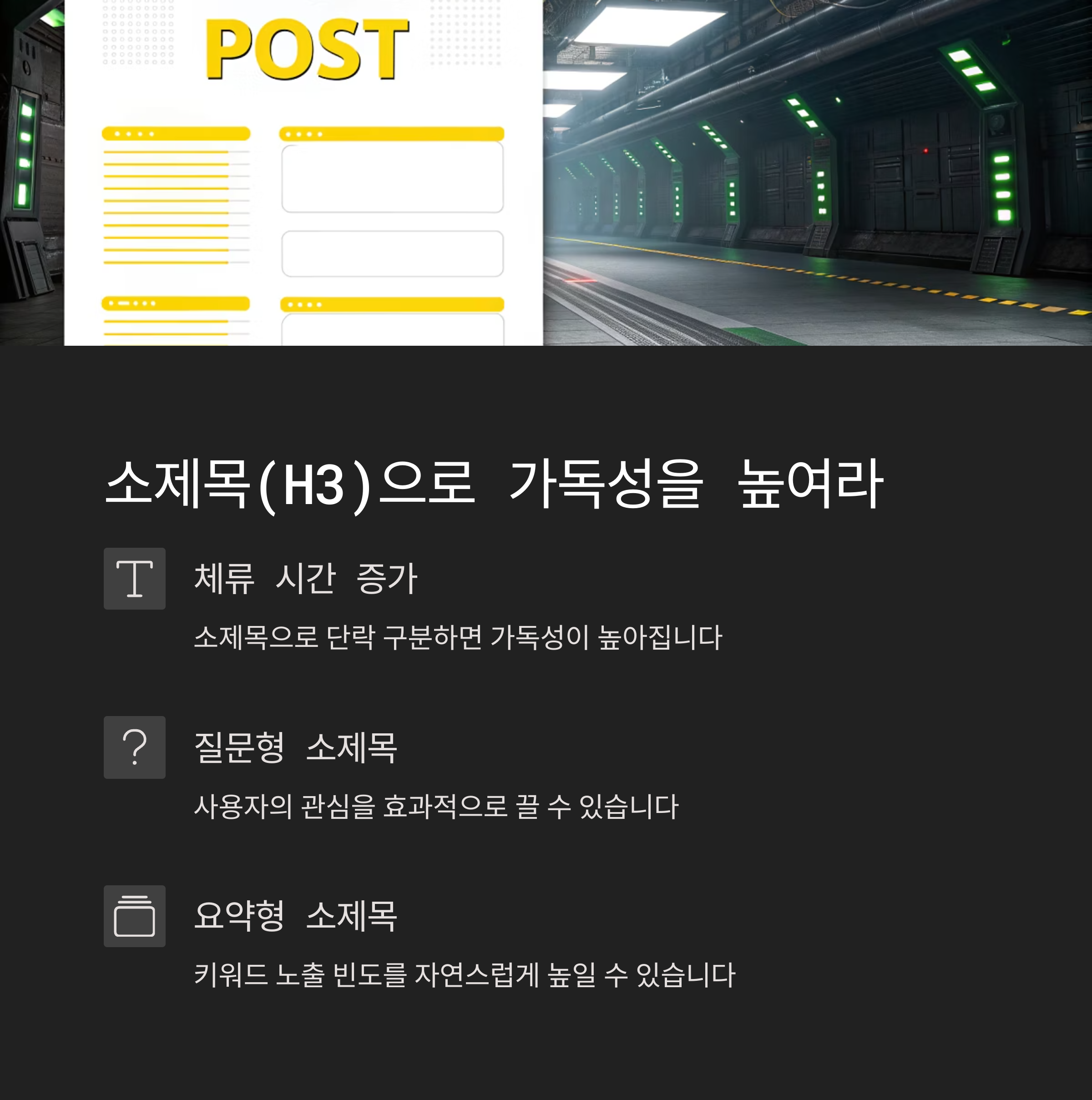 단순한 문단 나눔보다는 질문형, 요약형, 설명형 소제목을 사용해