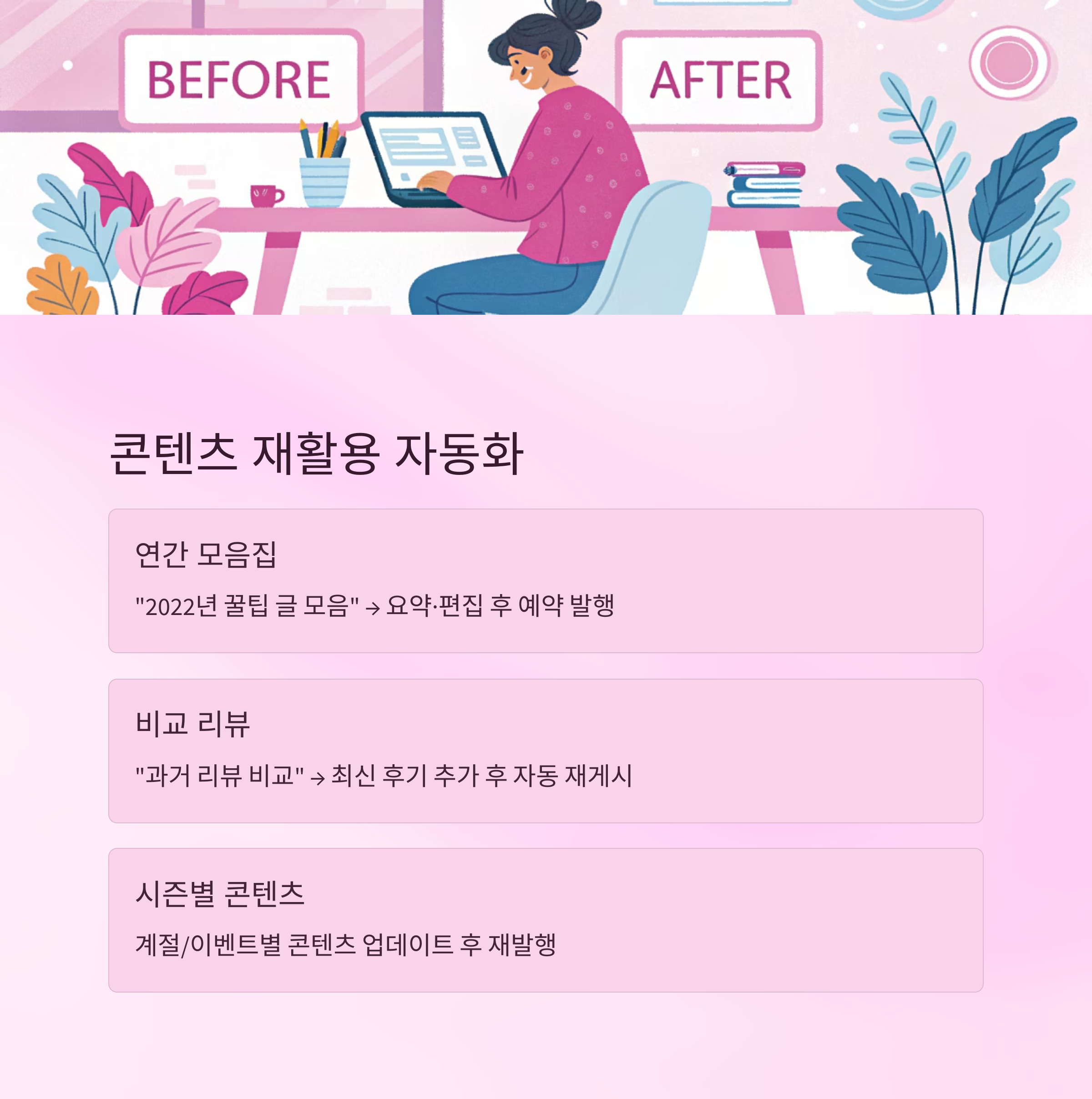 | "2022년 꿀팁 글 모음" → 요약·편집 후 예약 발행 |