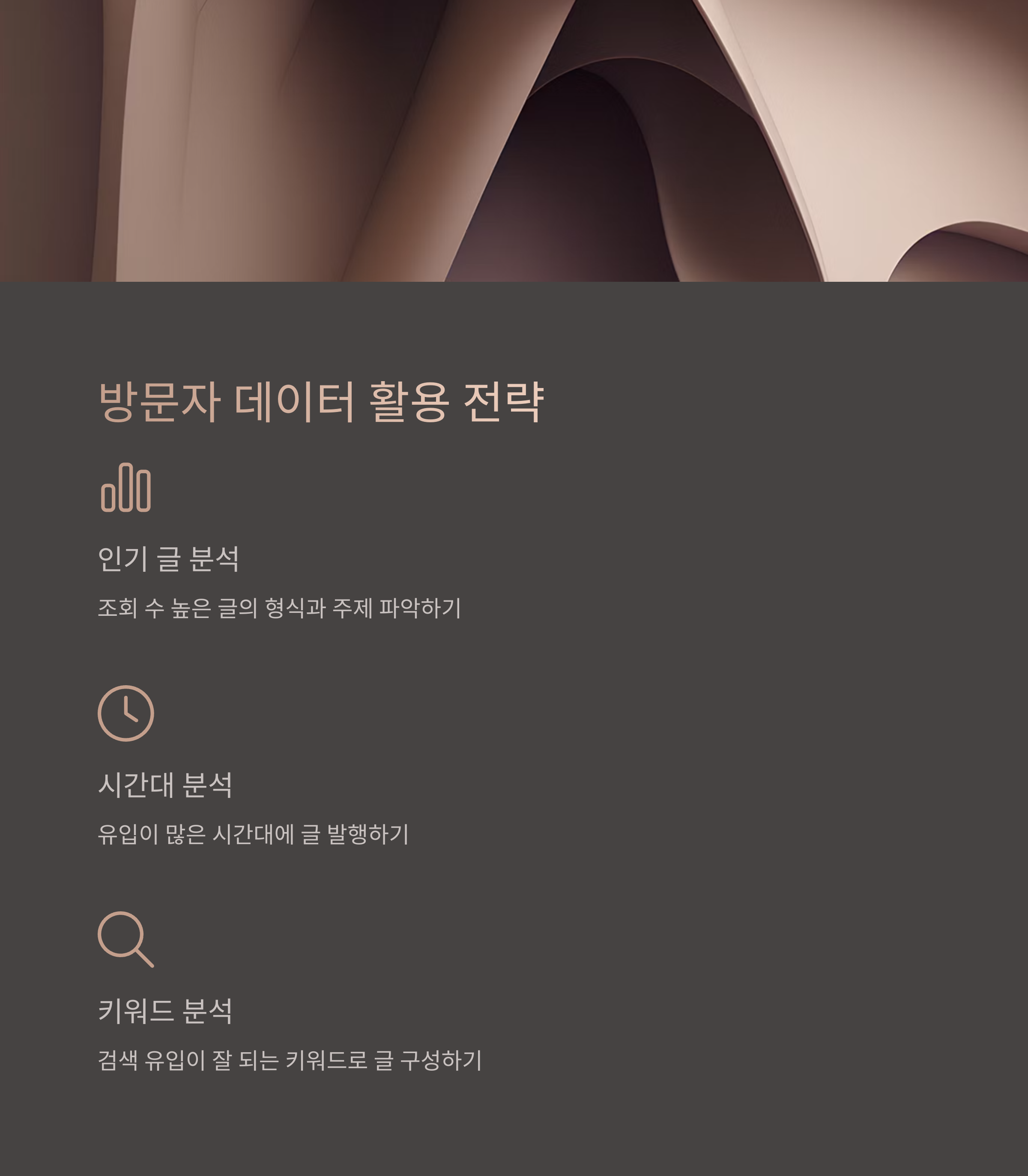 | 유입 키워드 분석 | 검색 유입이 잘 되는 키워드로 글 구성 |