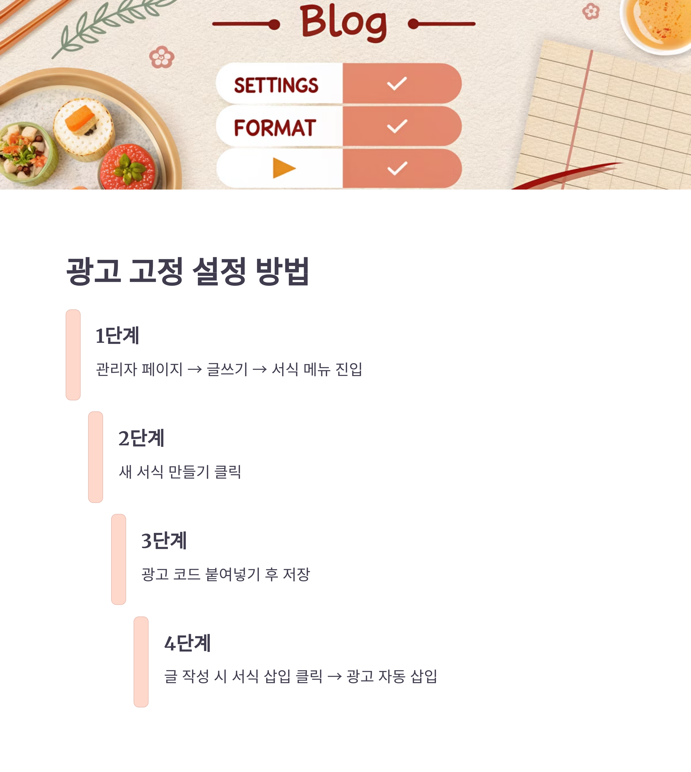 | 4단계 | 글 작성 시 서식 삽입 클릭 → 광고 자동 삽입 |