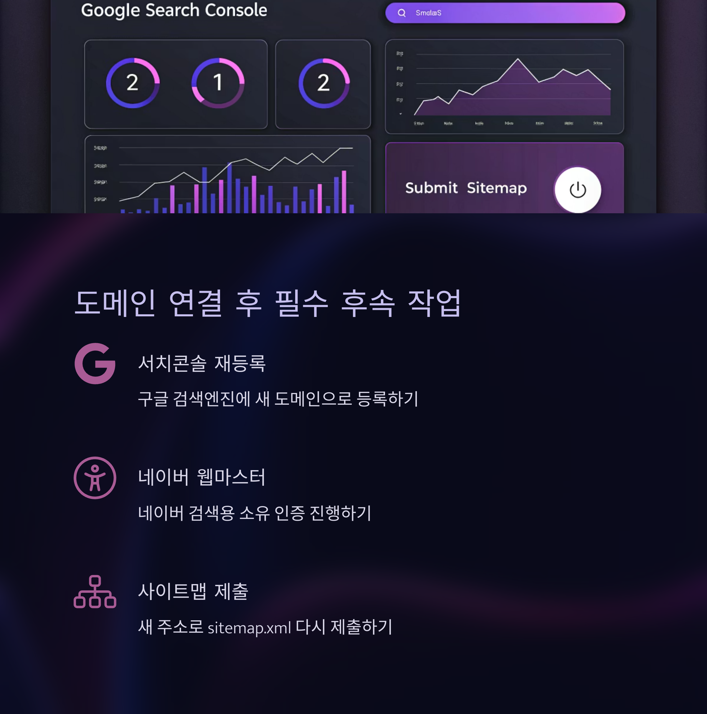 | 서치콘솔 재등록 | 구글 검색엔진에 새 도메인으로 등록 |