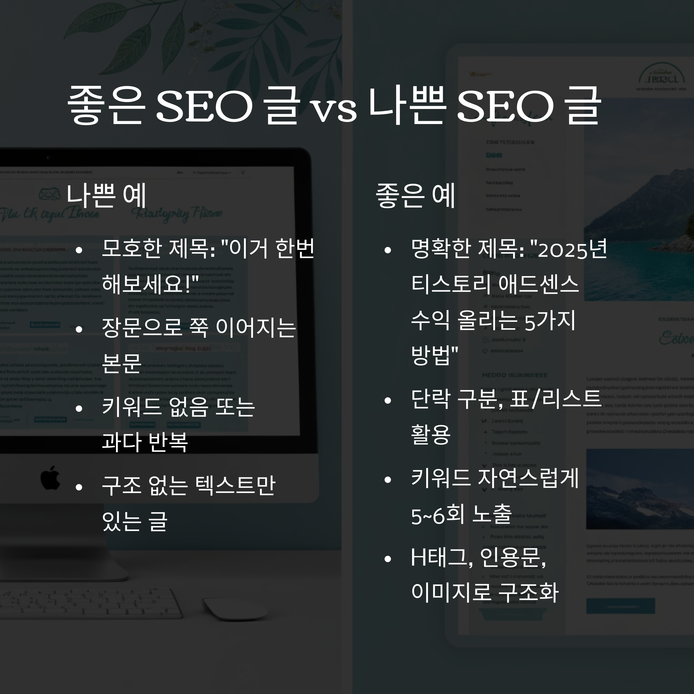 | 제목 | "이거 한번 해보세요!" | "2025년 티스토리 애드센스 수익 올리는 5가지 방법" |