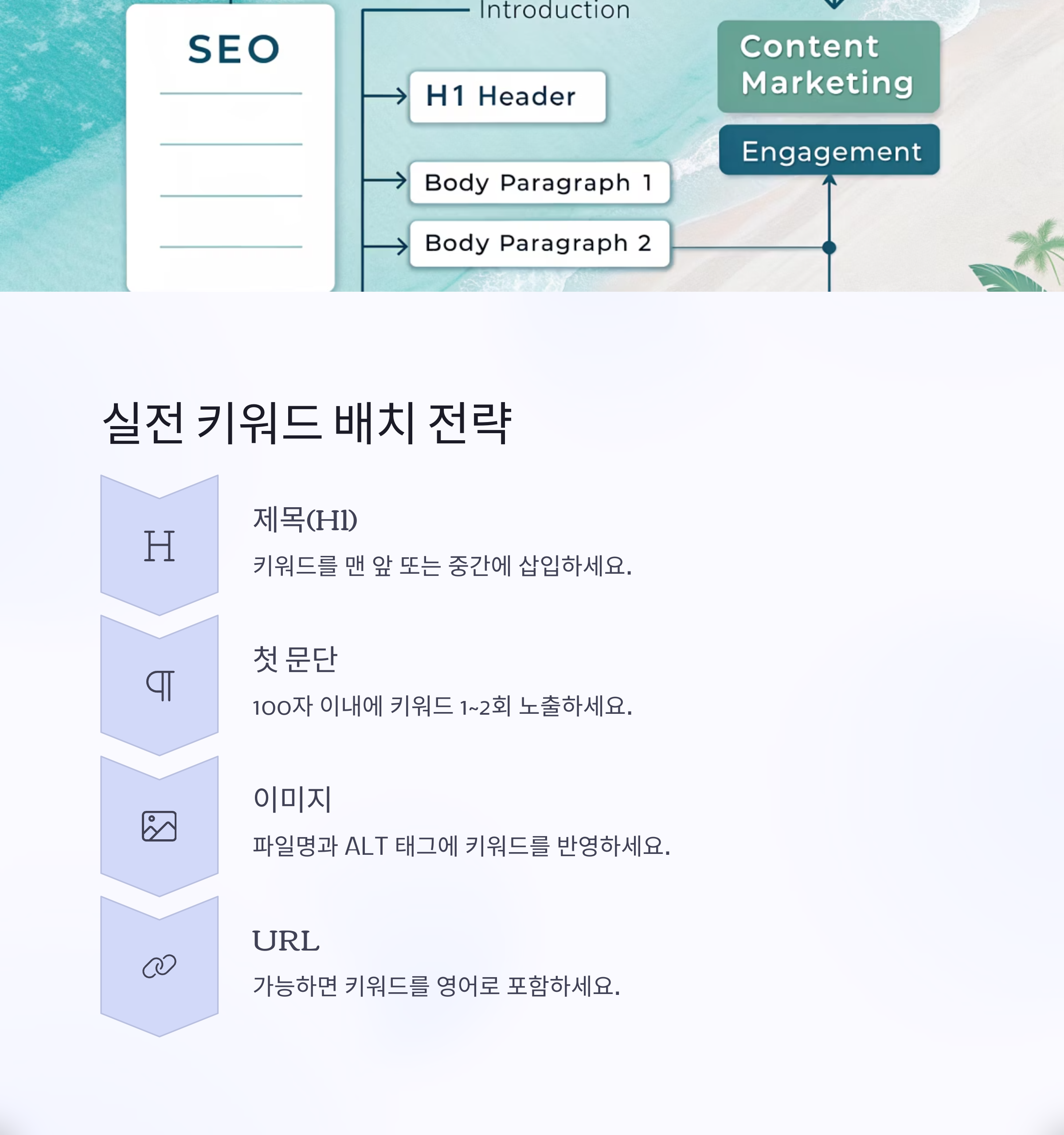 - 제목(H1): 키워드 맨 앞 또는 중간에 삽입