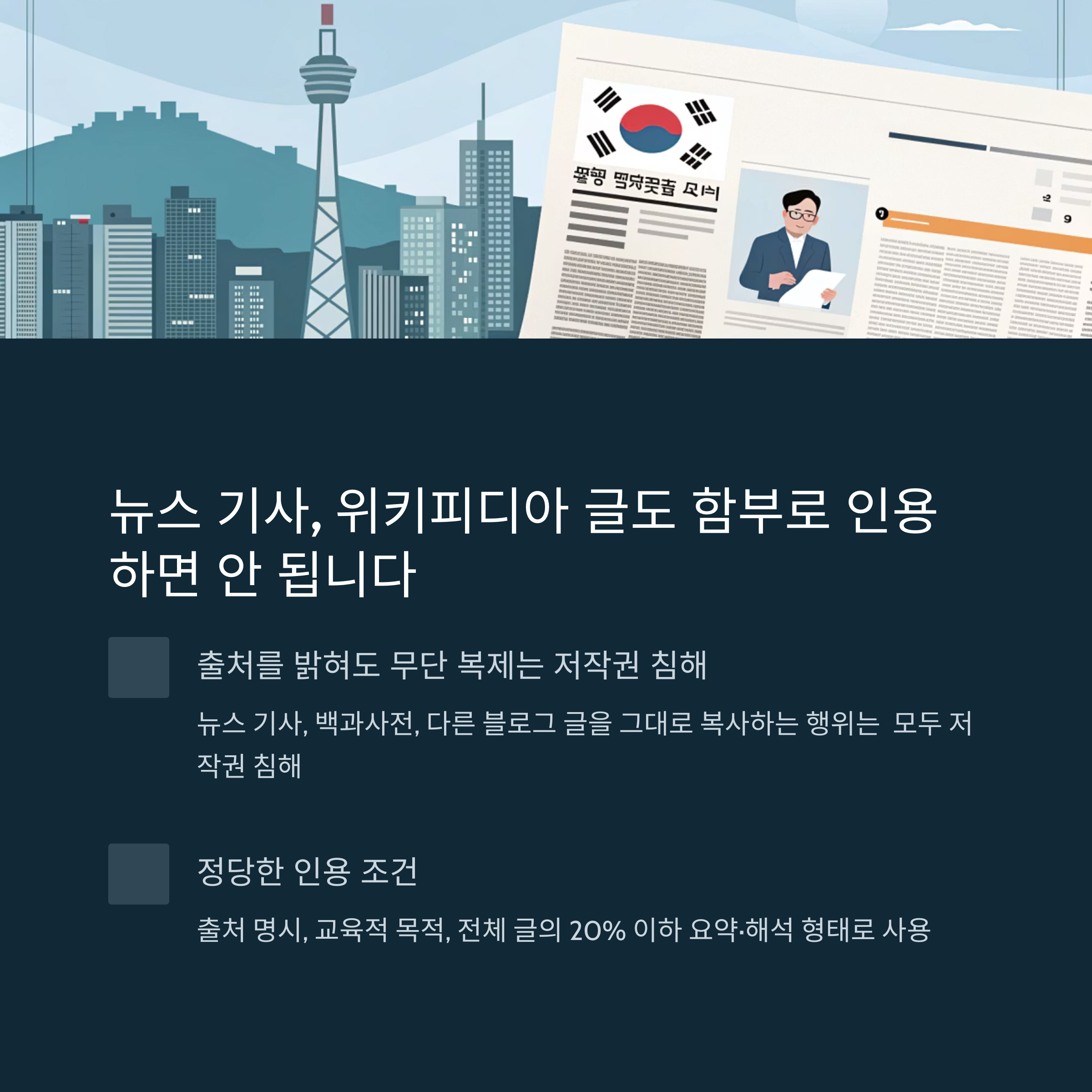 | 범위 제한 | 전체 글의 20% 이하, 요약·해석 형태 권장 |