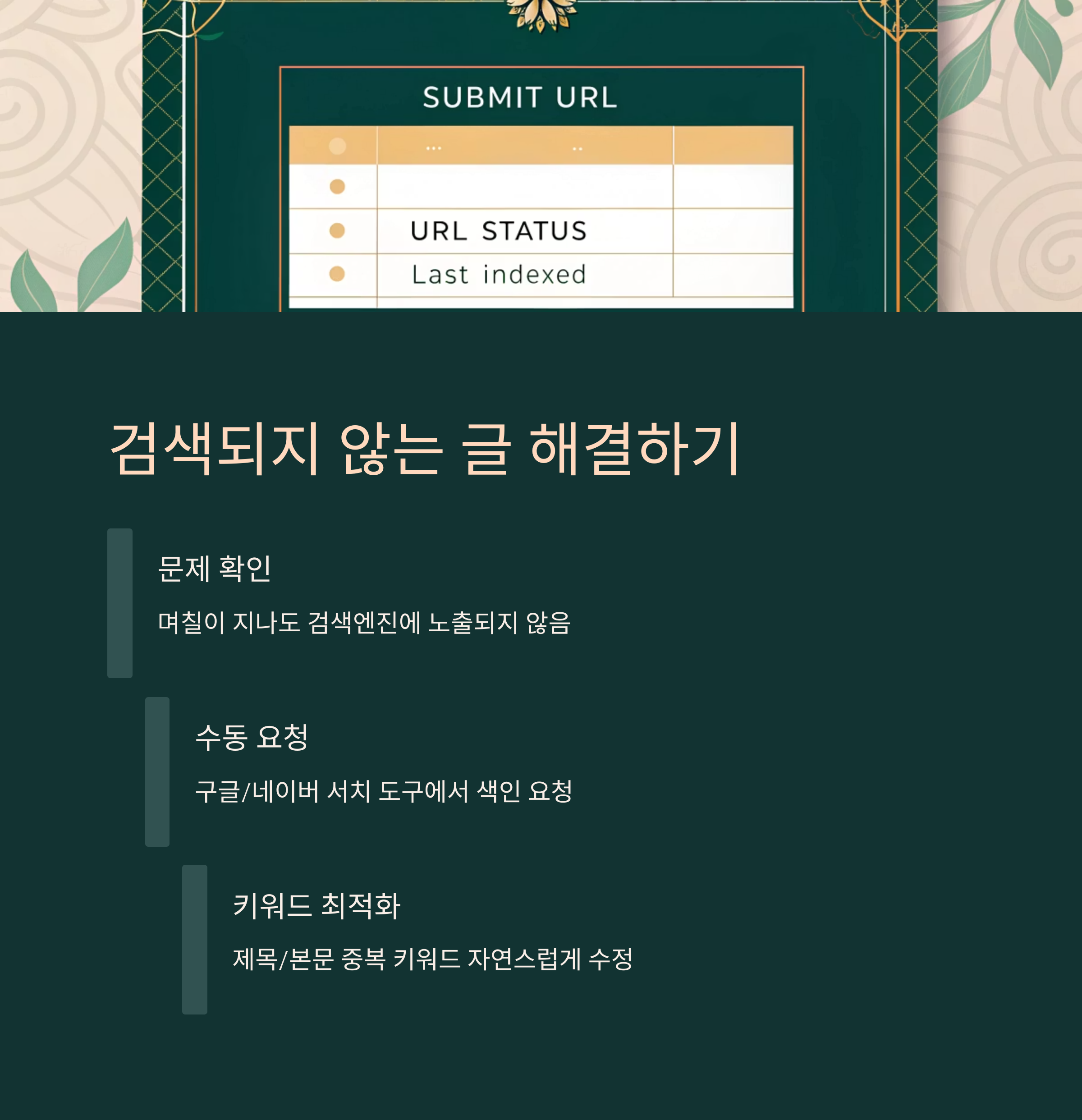 수동 요청과 키워드 최적화 후 1~2일 내 검색 노출이 회복되었고,