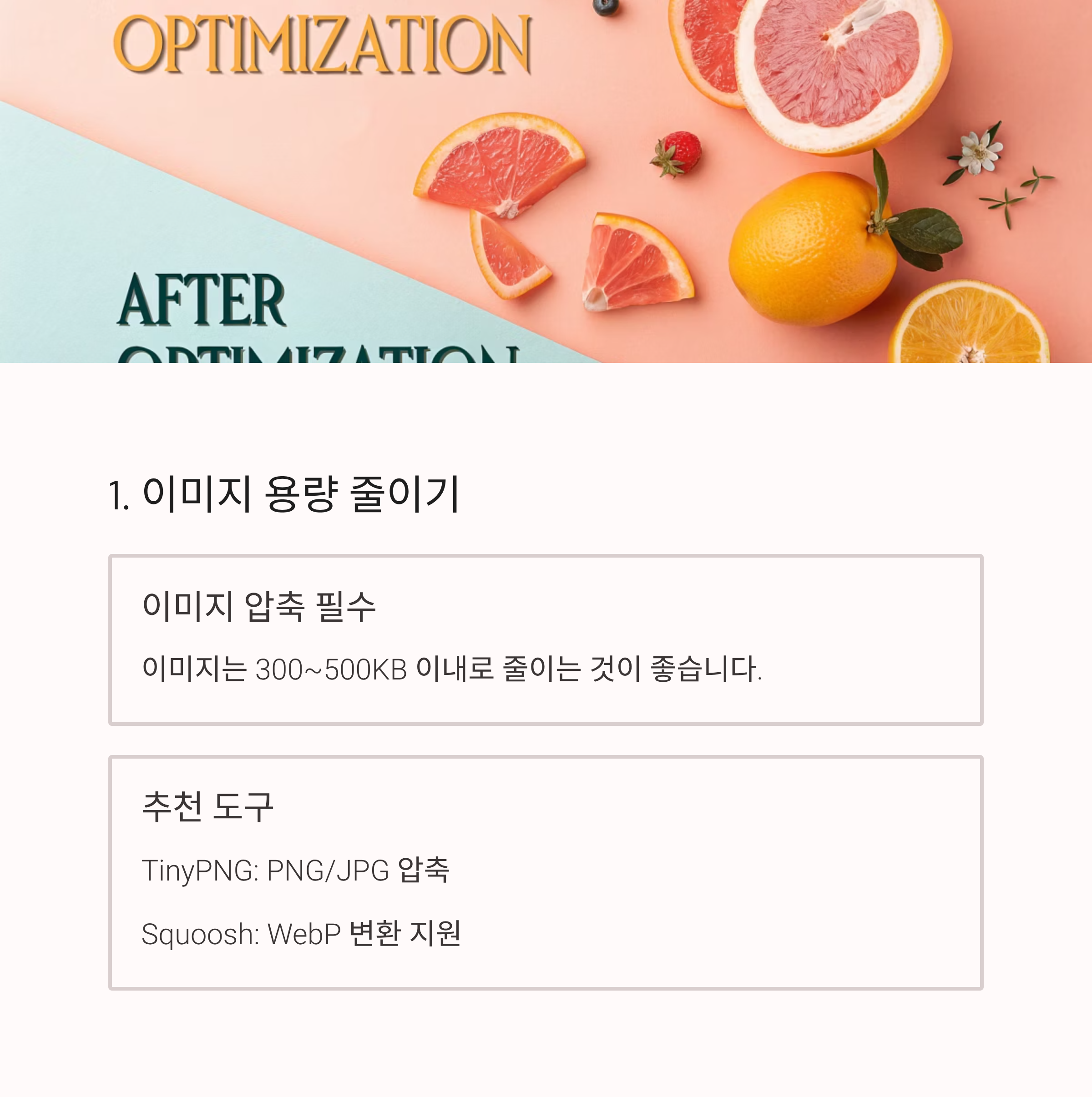 1. 이미지 용량을 줄이는 것이 가장 중요합니다