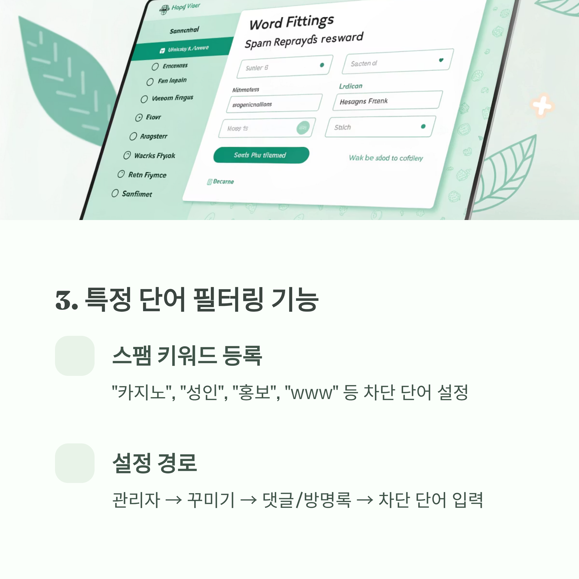 예: “카지노”, “성인”, “홍보”, “www” 등 스팸 키워드 등록