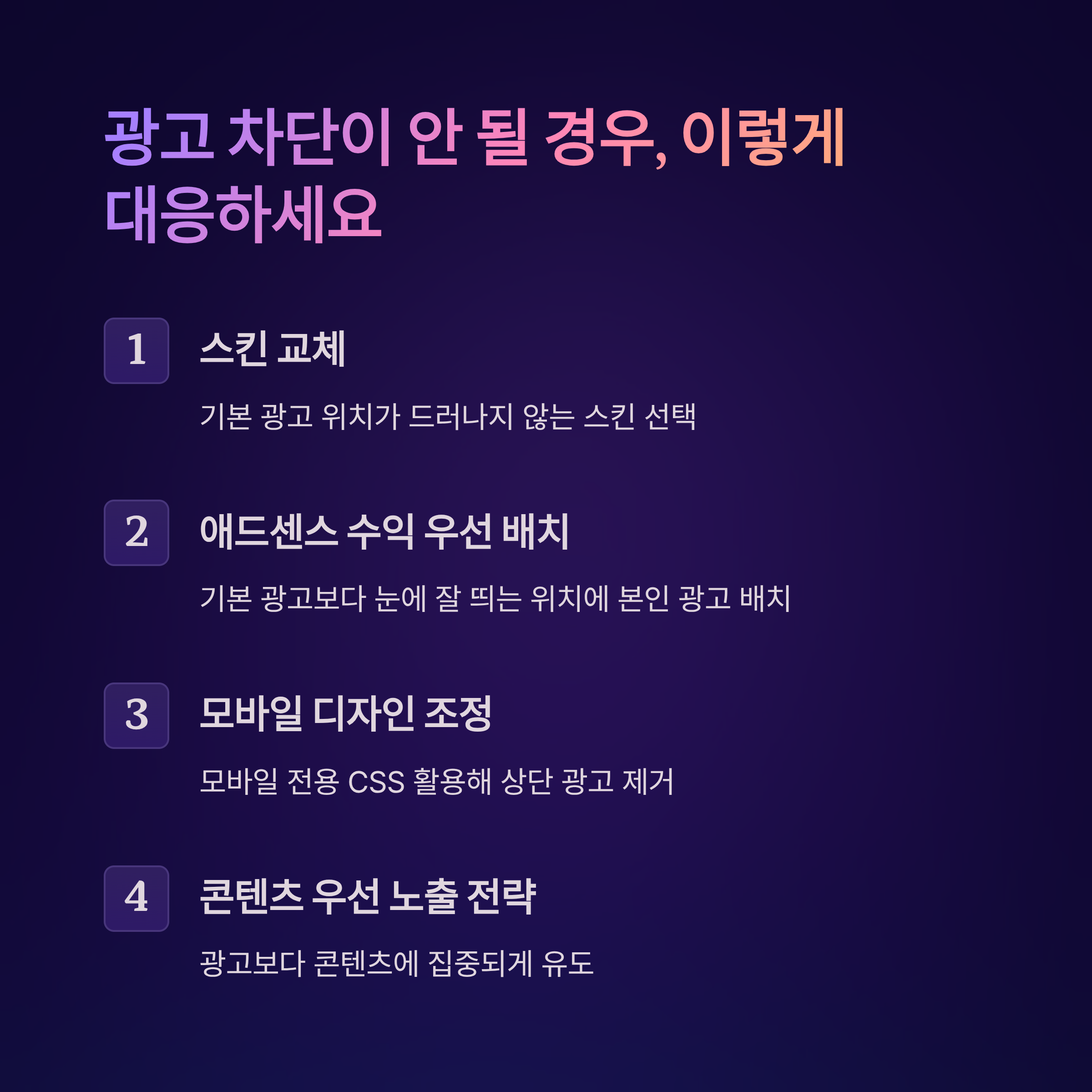 - 애드센스 수익 우선 배치: 기본 광고보다 눈에 잘 띄는 위치에 본인 광고 배치