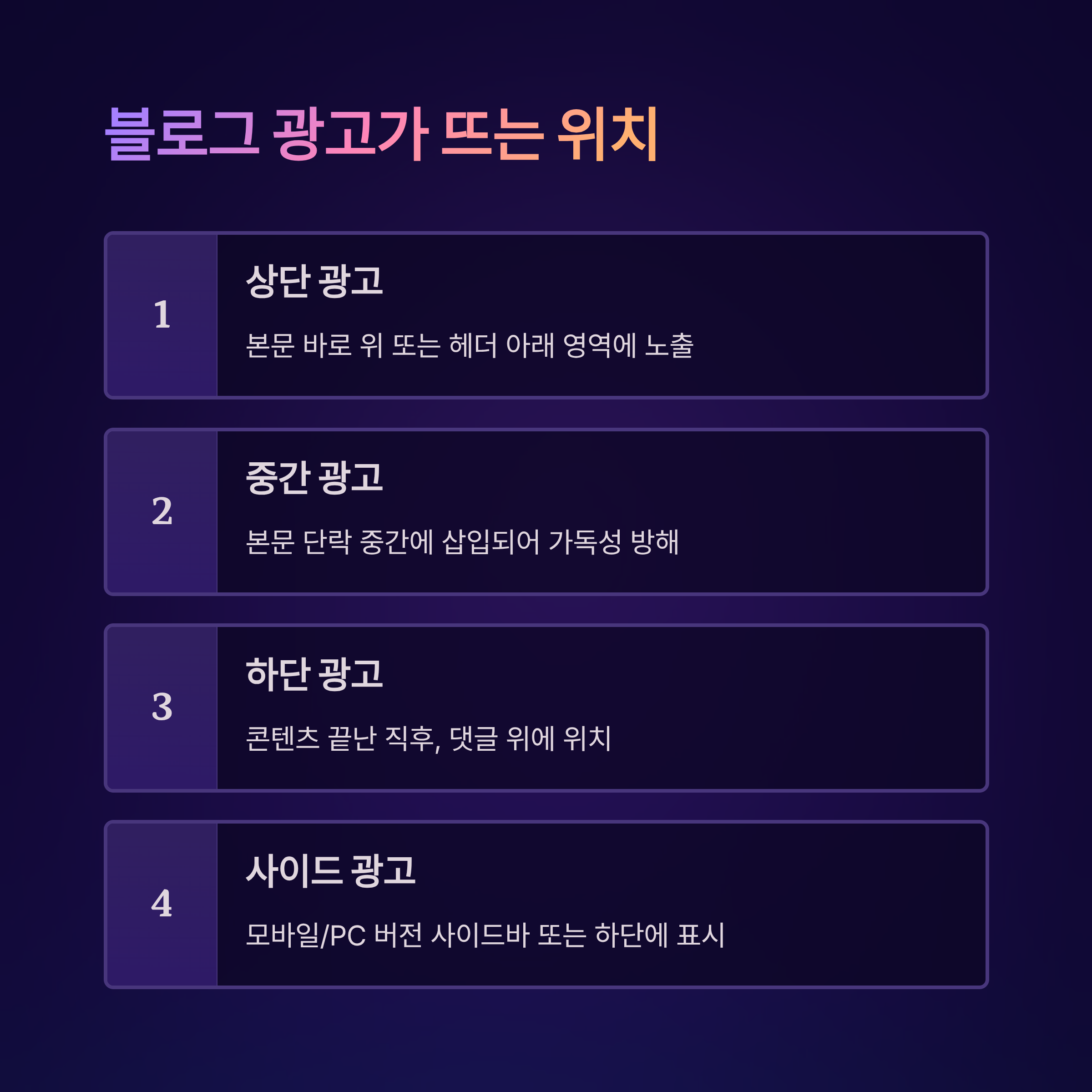 | 중간 광고 | 본문 단락 중간 삽입, 가독성 방해 |