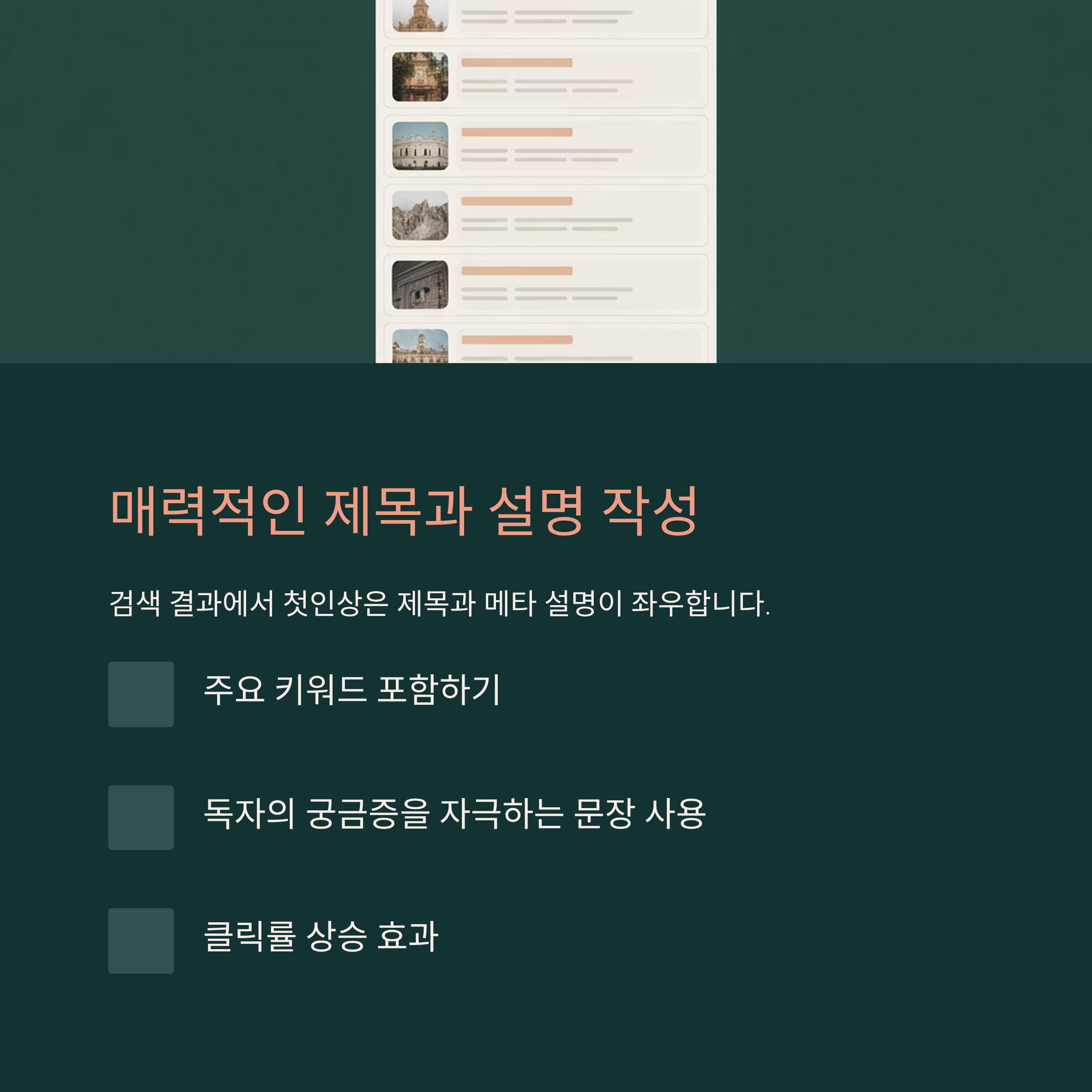 검색 결과에서 첫인상은 제목과 메타 설명이 좌우합니다.